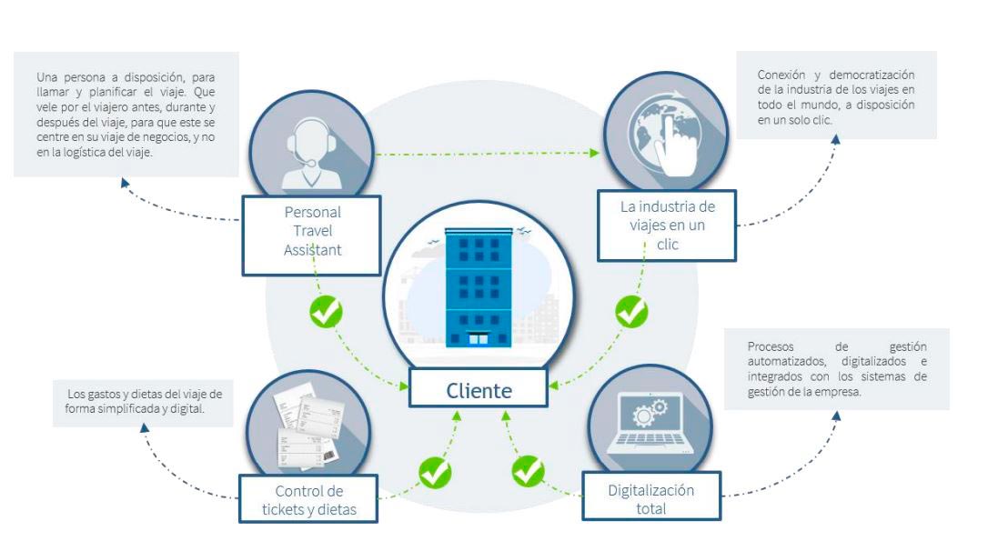 En este sentido, el nuevo sistema automatiza y digitaliza los procesos de los viajes de trabajo integrándolos, si el cliente lo necesita, en el sistema de la empresa, de forma que el usuario puede reservar su viaje, cumpliendo la política de la empresa y pasar gastos que se integran en el sistema de contabilidad. Todo ello ubicado en la nube permitiendo el acceso y análisis de datos en tiempo real. Además, lo hace humanizando la gestión ya que se le asigna una persona que le acompaña desde la reserva del viaje hasta su regreso, para que el usuario se centre en su viaje de negocios, no en la logística del viaje.