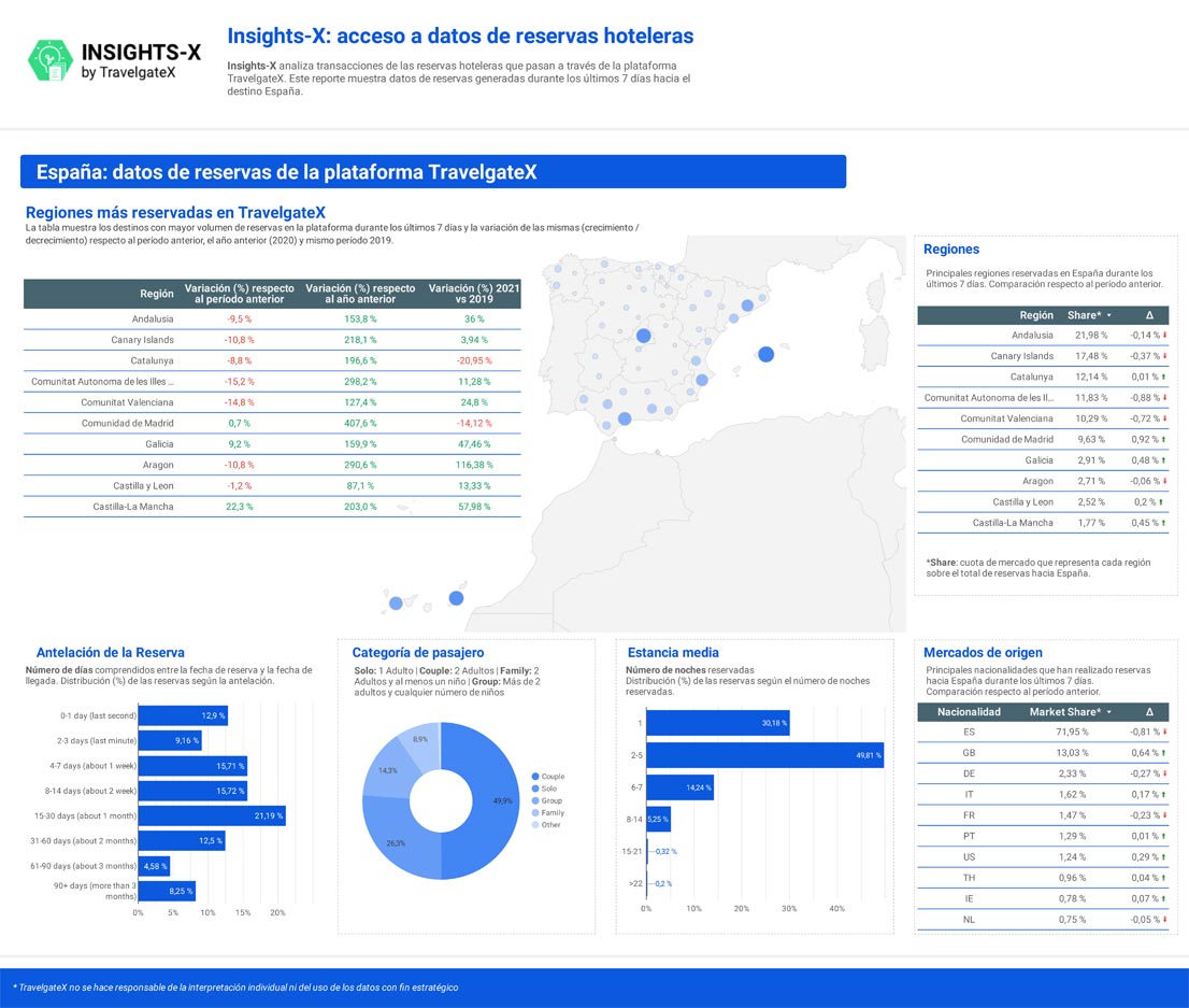 Como sigue siendo tradición, el 71,9% de las reservas realizadas entre los días 20 y 27 de septiembre provienen del mercado nacional, aunque el Turismo internacional empieza a dejar ciertos síntomas de recuperación. Los turistas británicos ya superan la barrera del 13% gracias al progresivo levantamiento de algunas restricciones. Los alemanes, por su parte, no terminan de arrancar, superando ligeramente el 2,3%. Otros grandes mercados emisores, como Francia, Italia o Estados Unidos, superan por poco el 1% de las reservas, notablemente lejos de los datos de antes de la pandemia.