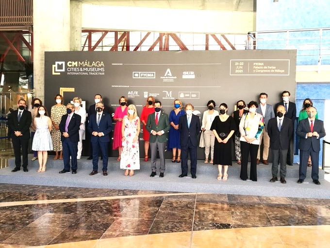 El presidente de la Junta de Andalucía, Juan Manuel Moreno; la teniente de alcalde y concejala delegada de Cultura y Deporte del Ayuntamiento de Málaga, Noelia Losada; el presidente del grupo editorial Vocento, Ignacio Ybarra; el presidente de la Diputación Provincial, Francisco Salado; la directora general de Industrias Culturales y Cooperación del Ministerio de Cultura y Deporte, Adriana Moscoso del Prado; el presidente de Acción Cultural Española, José Andrés Torres Mora, y el rector de la Universidad de Málaga (UMA), José Ángel Narváez, han participado en el acto inaugural de la primera edición de CM Málaga, Cities & Museums International Trade Fair, que tuvo lugar hasta este martes 22 de junio en Fycma (Palacio de Ferias y Congresos de Málaga).