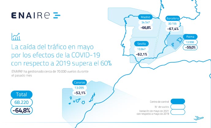 En este sentido, los vuelos nacionales en mayo (23.116), son los que mejor han evolucionado con una caída del 38,6% con respecto al mismo mes de 2019. Los internacionales, 32.231, se reducen el 72,3% con respecto a hace dos años, y los sobrevuelos (que no tienen su origen ni destino en un aeropuerto español), 12.873, bajan el 67,7%. Cabe destacar que todos los centros de control de Enaire registraron caídas en el tráfico en mayo con respecto al mismo mes de 2019: Canarias, el 52,1%; Palma, el 59,0%; Sevilla, el 62,1%; Madrid, el 66,8%, y Barcelona, el 67,4%.