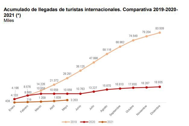 En el global del año 2021, la caída de las llegadas es de un 89,1% con una cifra total de 3,2 millones de visitantes, cuando en el año 2019 los datos ya ascendían hasta los 29,2 millones. Asimismo, en el mismo periodo de 2020 llegaron cerca de 10,6 millones, por lo que, pese al grave impacto de las restricciones desde el mes de marzo, las cifras de este año distan mucho de aquellas.