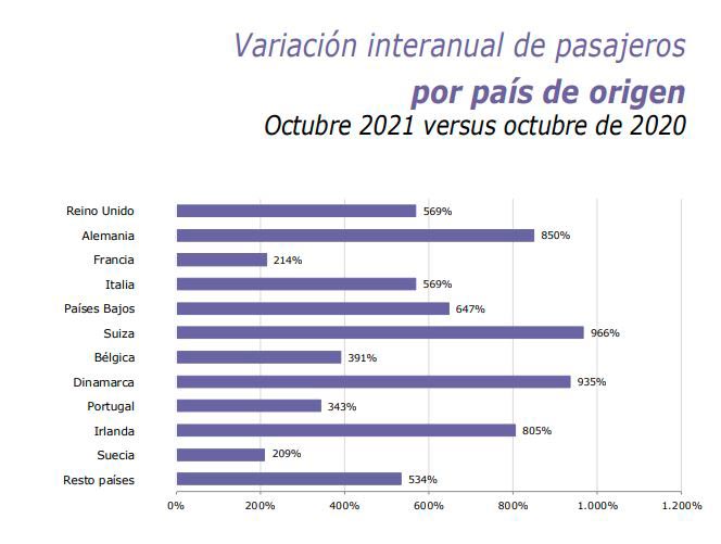 Una de las principales novedades que reflejan los datos de octubre es que Reino Unido se consolida como primer mercado emisor, con 1.107.954 pasajeros (20% del total), seguido de Alemania (18,8% del total), y Francia (8,1%). Igualmente, por primera vez un mercado prioritario para España muestra ya una recuperación total. Los pasajeros procedentes de Dinamarca, 145.818, representan un 2,3% más que los que viajaron en el mismo mes de 2019. Países Bajos, con 399.800 pasajeros, recupera el 98%; Bélgica, con 235.646, está ya al 84%; Suiza, con 247.125, al 83% o Alemania, al 77%.