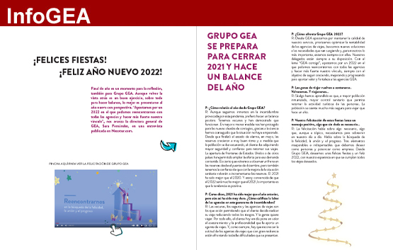 – Una entrevista realizada a la directora general del Grupo, Sara Fernández, donde se realiza un balance de 2021. ¡No te pierdas la felicitación de fiestas de Grupo GEA!