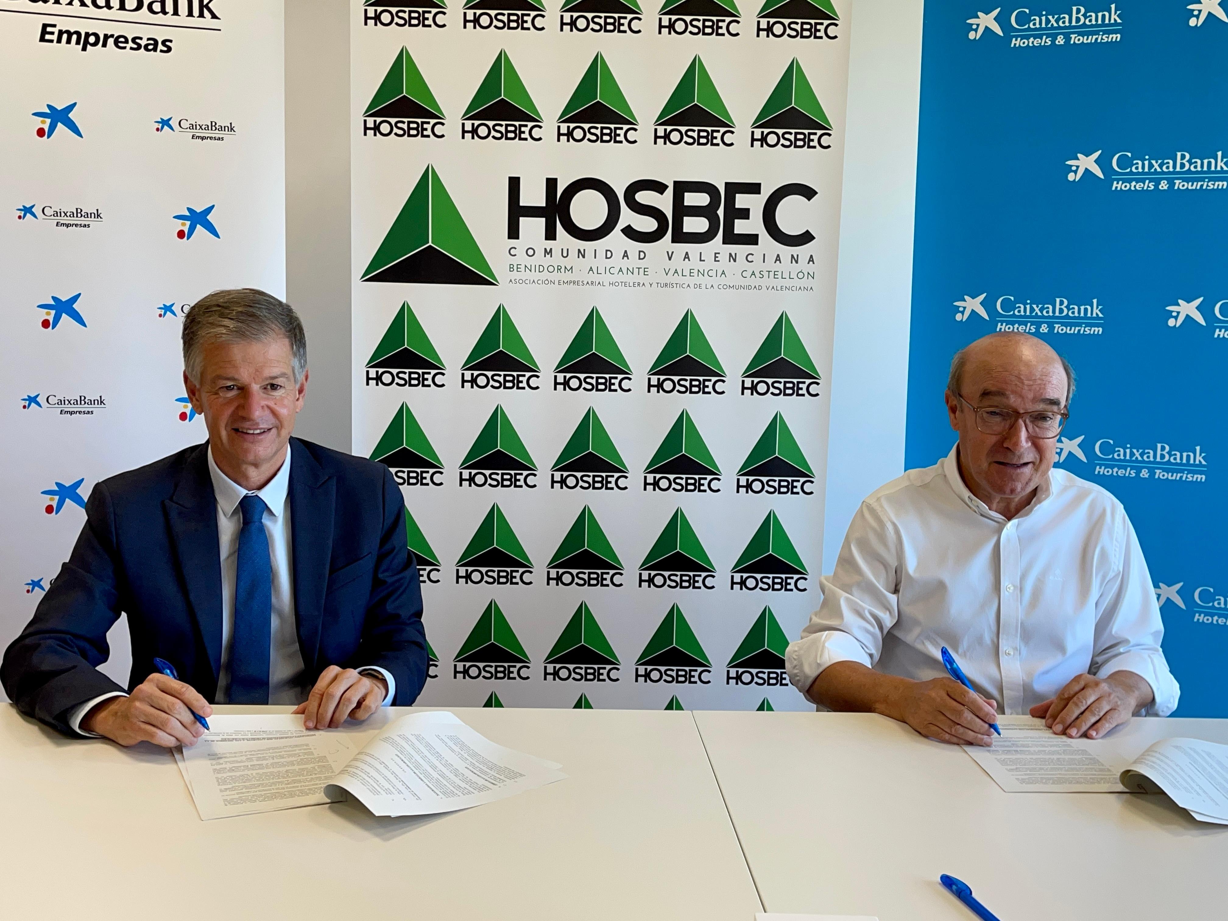 El acuerdo ha sido suscrito por el presidente de Hosbec, Antonio Mayor, y el director territorial de CaixaBank en la Comunitat Valenciana, Xicu Costa. La firma ha tenido lugar en la sede de Hosbec en Benidorm, edificio de Instituto Valenciano de Tecnologías Turísticas (INVAT.TUR). El convenio de colaboración prevé ventajas para los socios en la gestión de sus cuentas, tarjetas, transferencias y financiación.