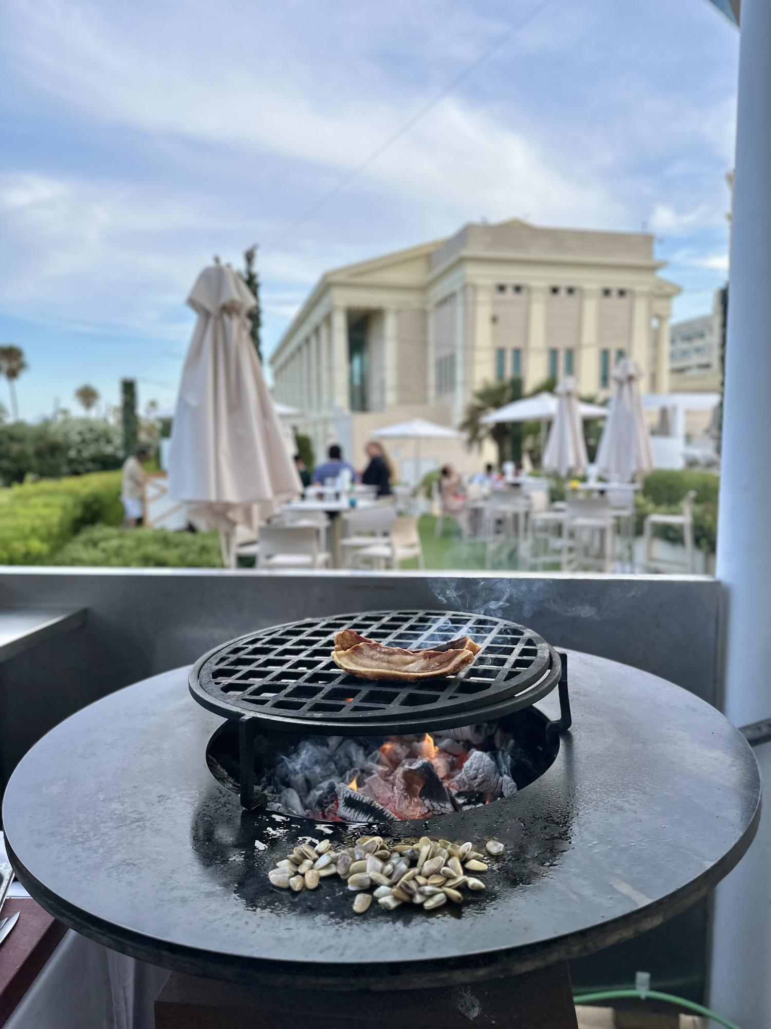 A partir de las 21:00h, los clientes que no se hospedan en el hotel también podrán acceder al establecimiento, momento en el que dará inicio el servicio de barbacoa en vivo. La carta del menú rinde homenaje a la simplicidad, ofreciendo jamón ibérico de bellota, quesos artesanales, tomates perfectamente maduros, coca de aceite y pinsa romana, entre otros platos.