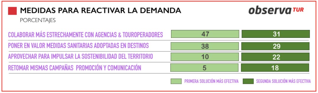 Los agentes de viajes miembros del Observatorio Nacional del Turismo Emisor (ObservaTUR) coinciden en que estrechar la colaboración con las agencias de viajes y los turoperadores será una decisión fundamental que contribuirá a que los destinos consigan remontar gradualmente la crisis. De hecho, un 78% lo señala como la primera o segunda solución más efectiva. Así, consideran que, tras la pandemia los destinos turísticos tendrán que reforzar su protagonismo para transmitir la nueva realidad generada en sus territorios tras la crisis sanitaria, en donde la seguridad jugará un rol clave.