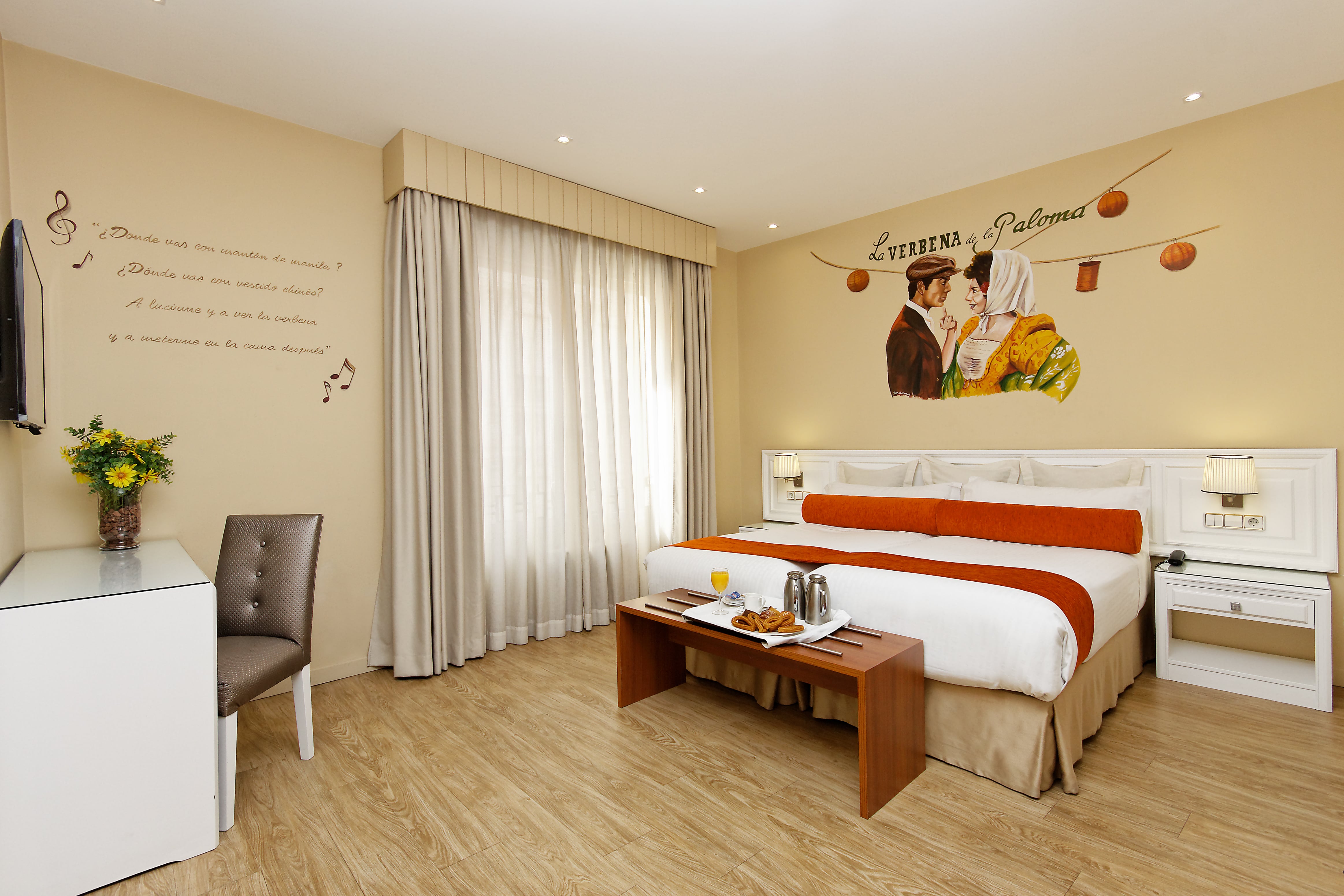 ¿Y puede haber algo más auténtico que alojarse en una habitación inspirada precisamente en esta celebración? El Hotel Mayorazgo, ubicado en el corazón de la capital, en plena Gran Vía, ofrece la habitación perfecta para la ocasión. «La de la Paloma«, con una decoración que traslada al huésped a la esencia más castiza, a un baile de chotis, a un sorbo de limonada fresca, a una degustación de barquillos…