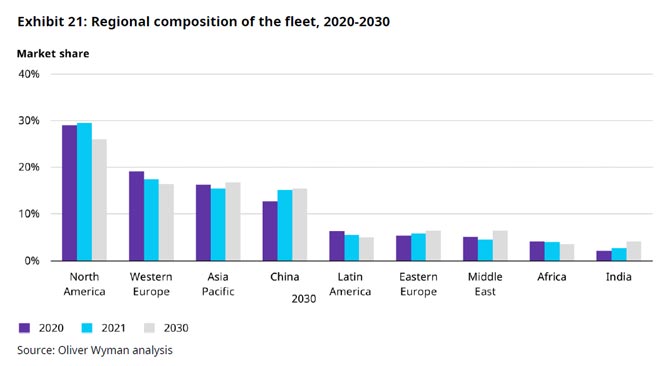 Este ajuste del crecimiento de la flota mundial de aviones responde en gran parte a las nuevas perspectivas para la demanda de pasajeros tras la pandemia. Según Oliver Wyman, la pandemia ha diferido las proyecciones en al menos dos o tres años, de manera que no se espera que la demanda de pasajeros alcance los niveles de 2019 hasta finales de 2022 y las previsiones que se tenían para 2030 ahora se sitúan en 2032 o 2033.