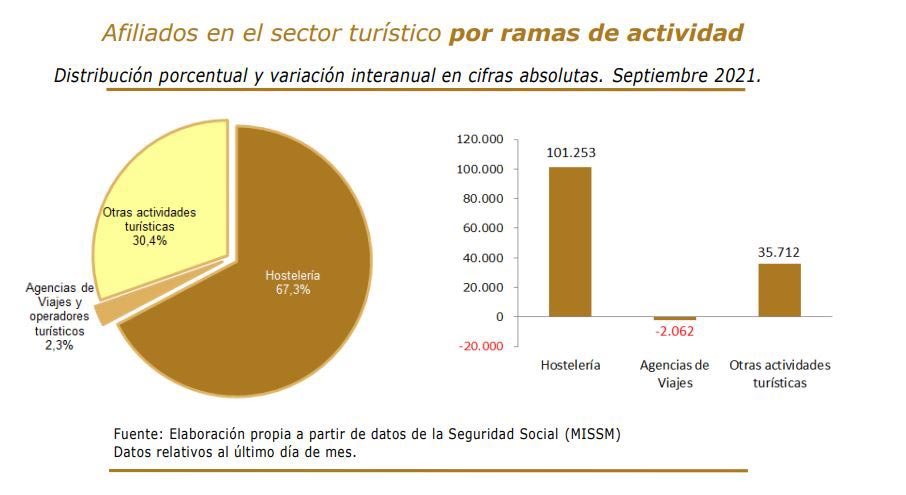 En términos generales, los afiliados a la Seguridad Social en el Sector Turístico, crecieron en septiembre en 134.903 trabajadores más que hace un año, un 6% interanual, hasta alcanzar los 2.365.731 empleados. En la hostelería hubo un crecimiento de 101.253 afiliados (55.934 en los servicios de comidas y bebidas y 45.319 en los servicios de alojamiento); con las otras actividades turísticas aumentando en 35.712 afiliados. Así, se trata del cuarto mes consecutivo que registra este crecimiento interanual. Con los datos de septiembre, el empleo en Turismo representa el 12,2% del total de afiliados en la economía nacional.