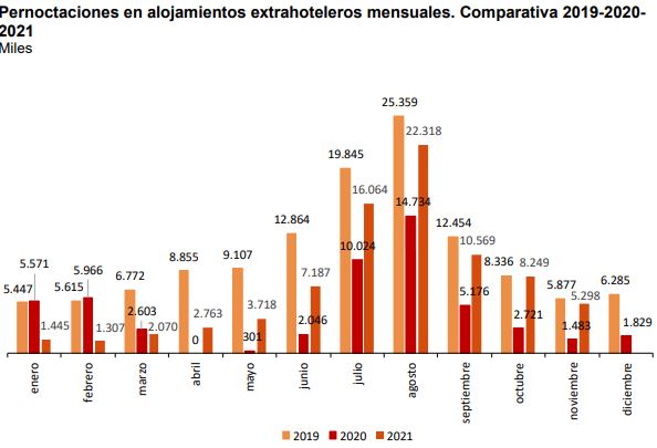 Durante los 11 primeros meses de 2021 el total de pernoctaciones en este tipo de establecimientos aumenta un 60,9% respecto al mismo periodo de 2020.