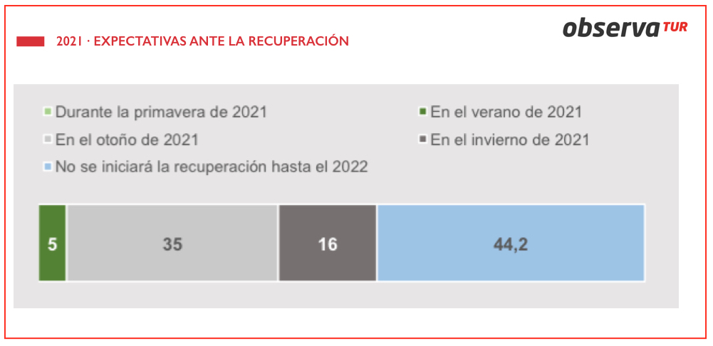 Un 16 por ciento cree, por el contrario, que ese impulso no se producirá hasta entrado el invierno de 2021. Un grupo amplio de agentes, mientras tanto, afirma que el restablecimiento de la actividad turística no se iniciará hasta el 2022.