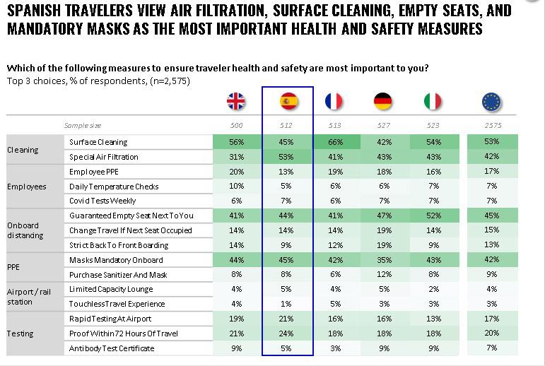 En este sentido, los españoles fijan las medidas de higiene y seguridad como elementos clave a la hora de realizar un viaje. Su decisión se basa en la eficiencia de los sistemas de filtrado de aire en los medios de transporte (53%), la limpieza de las superficies (45%), la obligatoriedad de la mascarilla (45%) y la seguridad de contar con un asiento vacío a su lado en los aviones y trenes (44%). No obstante, el precio de los billetes sigue es el factor más importante. El 78% ha manifestado esta preocupación para los billetes de avión y el 72% a la hora de realizar una reserva de hotel.
