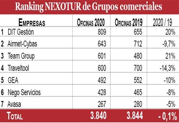 El Ranking NEXOTUR de Grupos comerciales, que se basa únicamente en el número de puntos de venta, está liderado de manera contundente por DIT Gestión, que sumó 809 puntos de venta al cierre de 2020, alcanzando los 821 a fecha 1 de marzo. Esto supone un sorprendente crecimiento del 20% respecto al año anterior, cuando disponían de 655. Además, informan a este periódico de que disponen de cerca de 200 agentes particulares. «A pesar de toda esta pesadilla vivida, durante el año 2020, 154 agencias de viajes muy consolidadas en el mercado han decidido dar un giro importante en la digitalización y rentabilidad de su negocio, uniéndose al ambicioso proyecto de DIT Gestión», destaca el director comercial del grupo, Lander Arriaga.