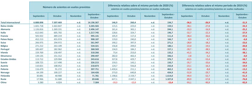 Los mercados que presentan una mejor evolución son Dinamarca y Países Bajos, con un volumen de asientos programados hacia España en los meses de septiembre y octubre que alcanza el 96% (290.447 plazas) y el 93,2% (908.187 asientos) de la capacidad aérea del mismo periodo de 2019, respectivamente. Por su perte, desde Reino Unido se prevé operar entre septiembre y octubre más de 3,2 millones de asientos (el 66,7% de lo que se operó en los mismos meses de 2019); desde Alemania 2,5 millones de asientos (el 75% de 2019), desde Italia 1,2 millones de plazas (el 72%) y desde Francia más de 995.000 asientos (el 62% de lo operado en los mismos meses de 2019).
