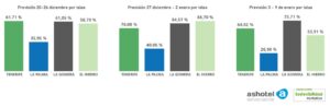 Los establecimientos hoteleros y extrahoteleros asociados a Ashotel prevén una ocupación media en el conjunto de la provincia de Santa Cruz de Tenerife del 65% para el periodo navideño, comprendido entre el 20 de diciembre y el 9 de enero, según la encuesta interna que realiza la patronal hotelera para los grandes periodos vacacionales. Este dato se eleva al 67% de media en la isla de Tenerife y representa 21 puntos porcentuales menos de lo estimado en el mismo periodo de 2019, año prepandemia.